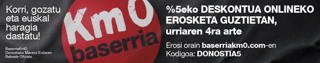 Euskal kooperatiba honek online denda erakargarria du. Eta Donostia Rural Kutxako Maratoi Erdiko lagun guztiok %5eko deskontua izan dezakezue Baserria Km0ren webgune ofizialean egindako online erosketa guztietan (urriaren 4ra arte balio du hemen) Erabili beharreko kupoia DONOSTIA5 da.
